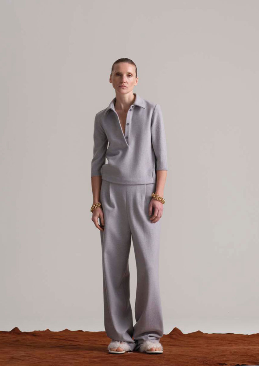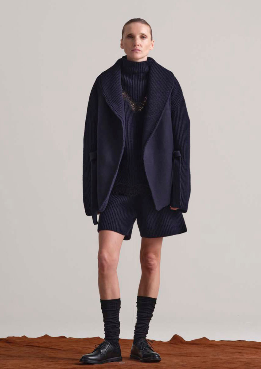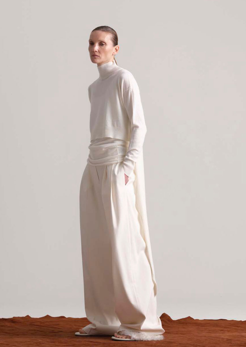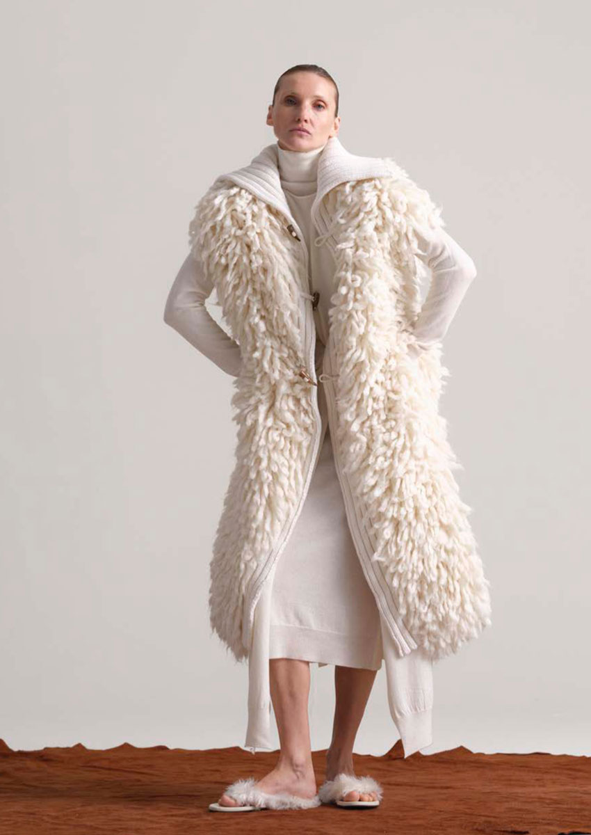 Designer Daniele Calcaterra, 1973 in Mailand geboren, bringt seine Erfahrung aus internationalen Luxusmarken und sein Gespür für Stoffe, Formen und Bewegungen ein. Seine Handschrift verbindet italienische Handwerkskunst mit innovativem Design, minimalistisch und doch raffiniert.